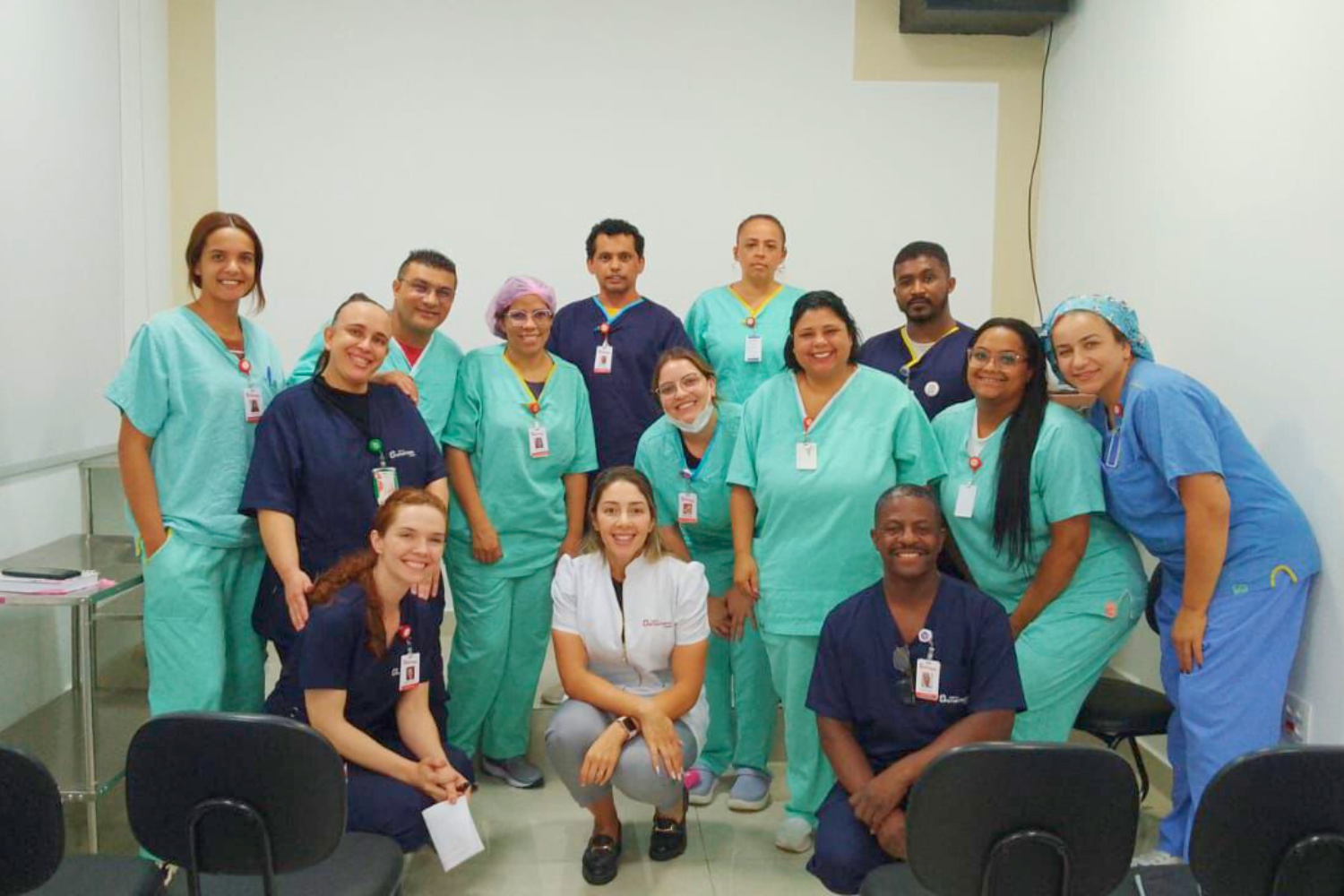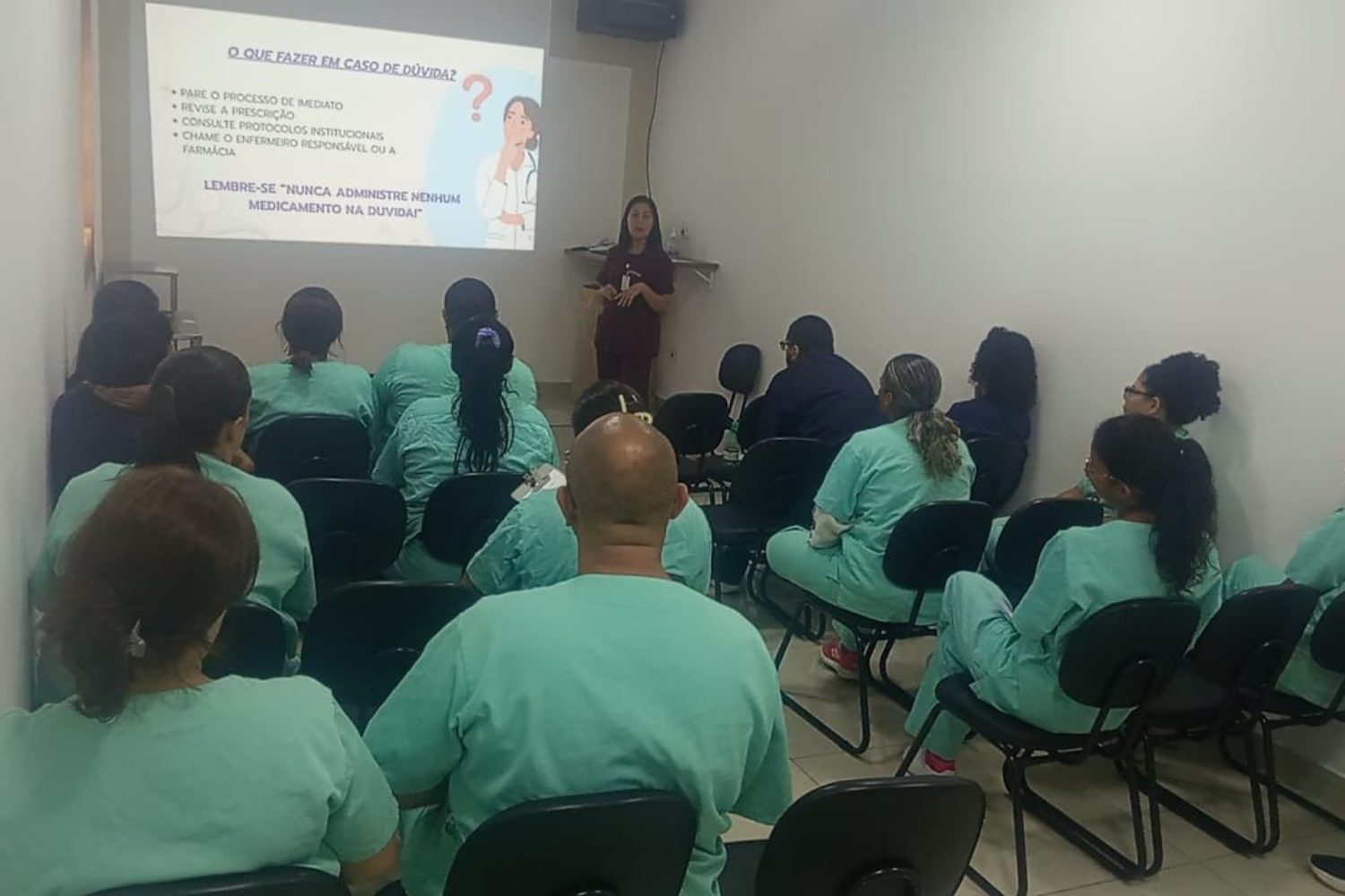 A capacitação foi conduzida pelas estagiárias do Núcleo de Segurança do Paciente (NSP) e da Educação Continuada, com a supervisão das enfermeiras do NSP e da Gerência de Enfermagem, reforçando o compromisso institucional com ações educativas baseadas em análise de risco e melhoria de processos.
